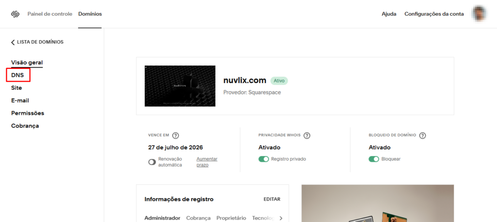 9. Depois que a transferência for concluída, o menu de alteração dos nameservers aparecerá no menu esquerdo da tela: