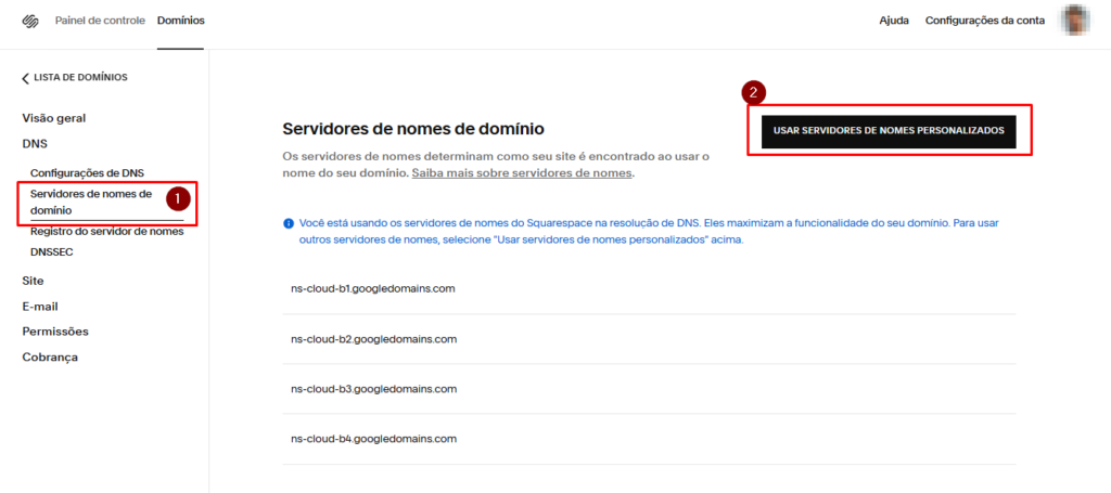 10. Logo depois, você deve clicar em “Servidores de nomes de domínio” e depois em “Usar Servidores de Nomes personalizados”;