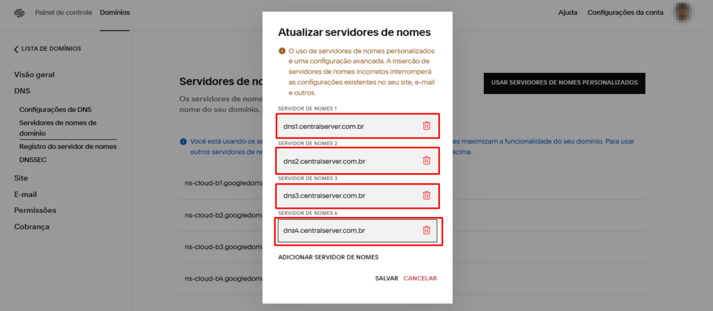 Observação: Este procedimento é voltado para clientes que utilizam o painel de DNS da CentralServer. Se você utiliza outro painel de DNS, como o Cloudflare ou outro, é necessário configurar os servidores de nomes fornecidos pelo seu provedor.