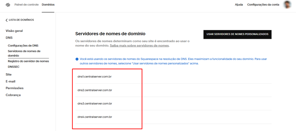 Esse guia tem como objetivo auxiliar o cliente a realizar a alteração dos nameservers do painel da Squarespace para os da CentralServer.