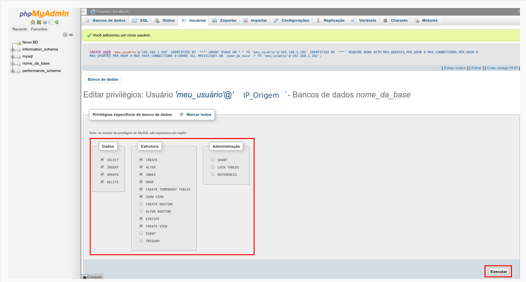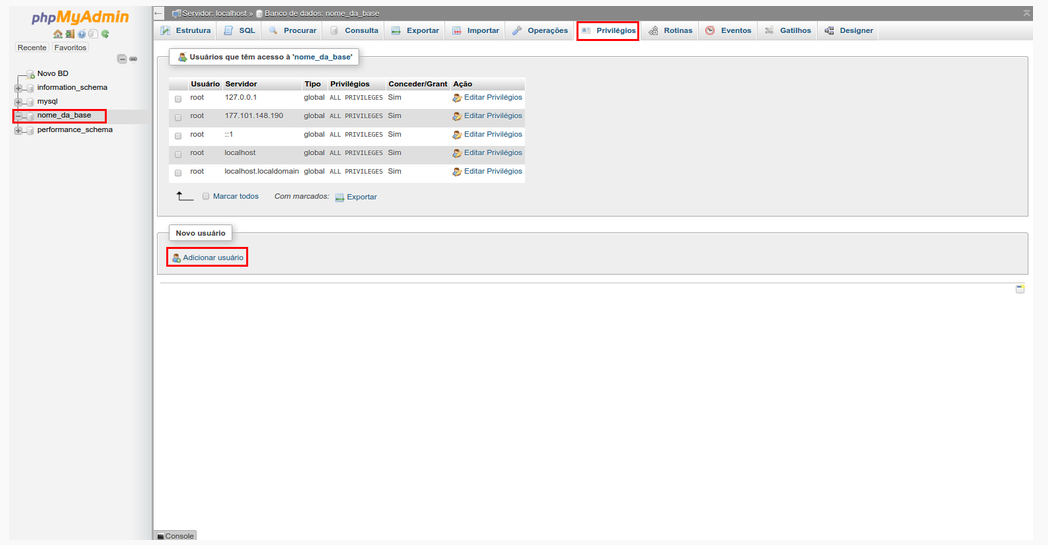 1. Acesse p phpMyAdmin com o usuário “root” do MySQL”;