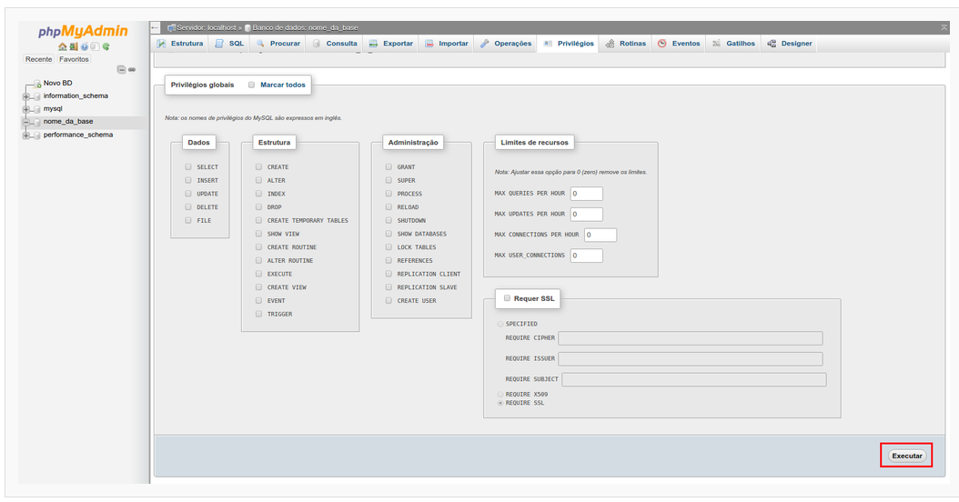 6. Em privilégios globais deixe todas as operações de usuário desmarcados;