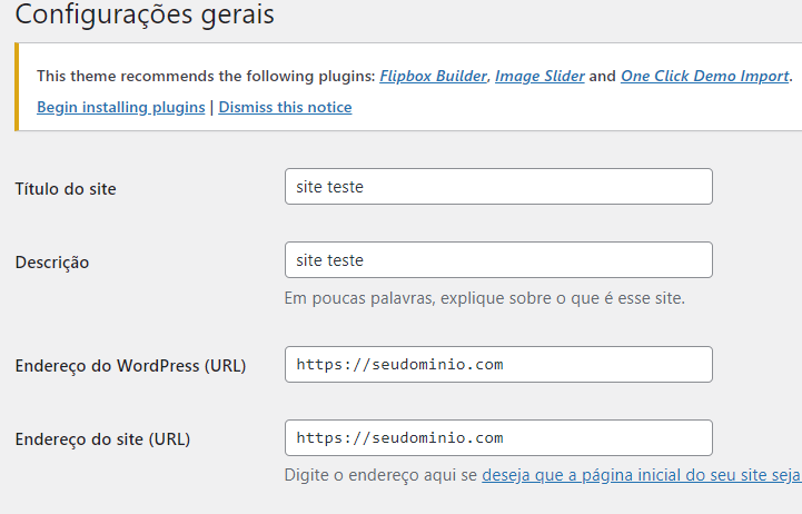 Acessando a área administrativa do WordPress em Configurações na aba Geral nos deparamos com os campos Endereço do WordPress (URL) e Endereço do site (URL), que devem estar como seudomínio.com.br ou seudomínio.com.br/pasta_wp.